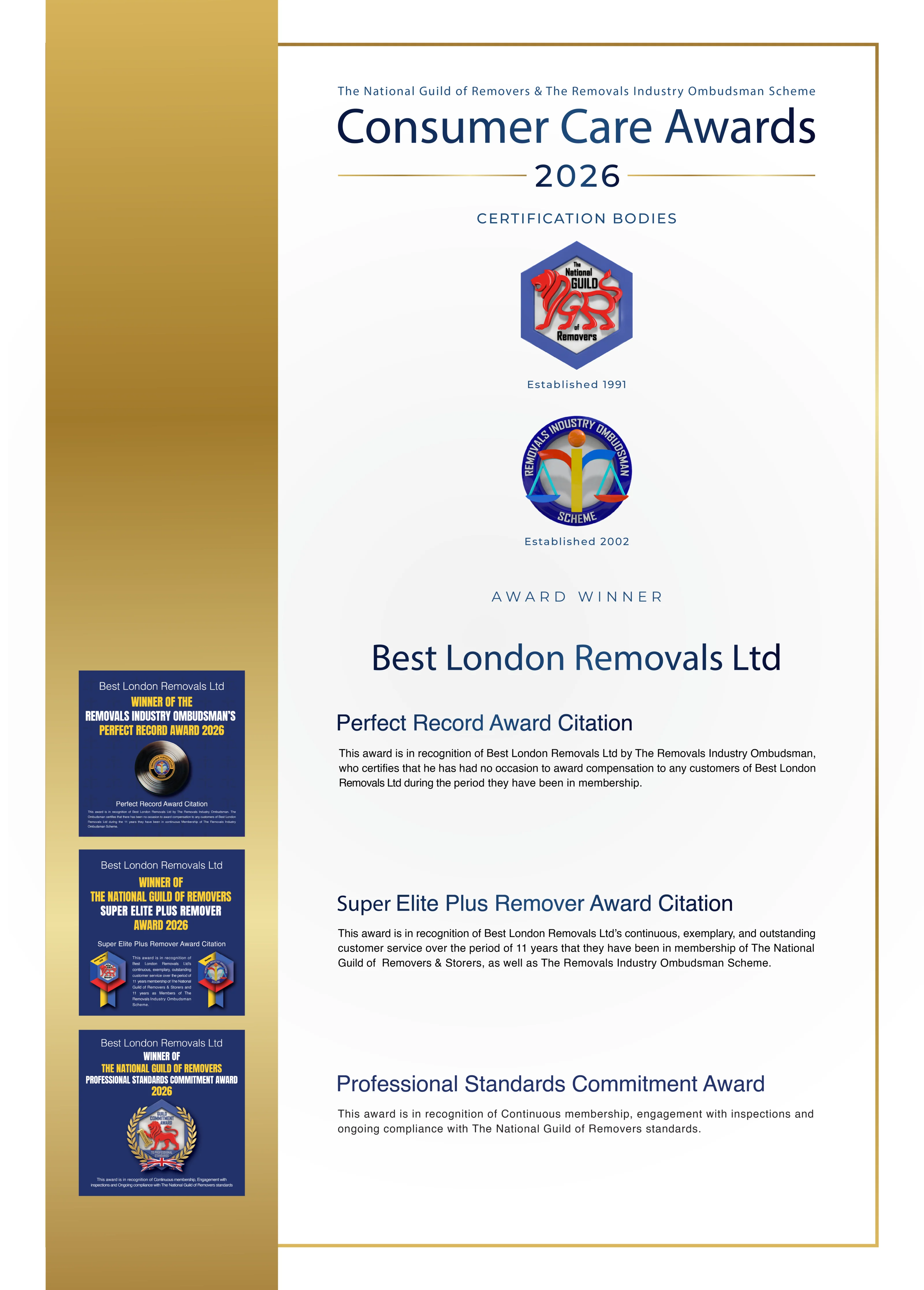 In 2026, Best London Removals was awarded three NGRS honours: the Super Elite Plus Remover Award, the Perfect Record Award (zero compensation claims across 11 years), and the Professional Standards Commitment Award.